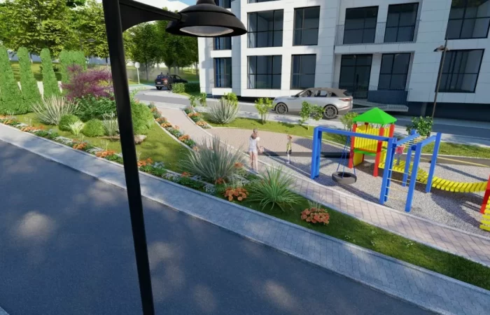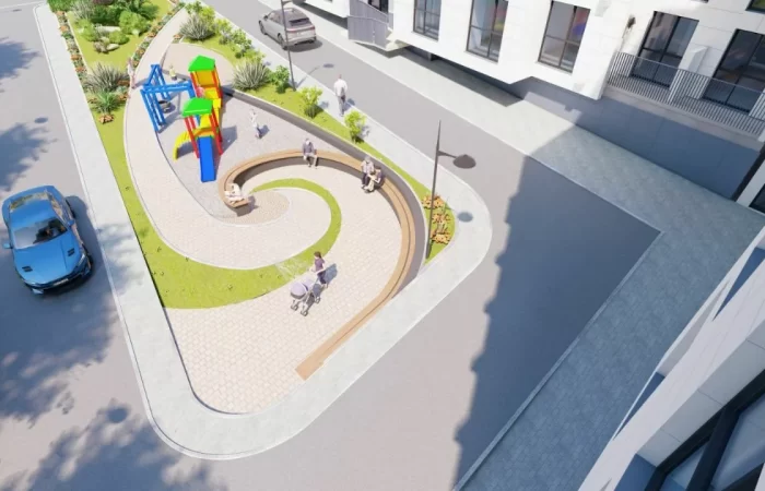The interior courtyard and adjacent area of the complex will be landscaped with architectural elements, benches, recreational areas, trees, lawns, shrubs + between the residential complexes Art Residence and the adjacent residential complex there will be a landscaped green area (this is a service area, where construction is not permitted).